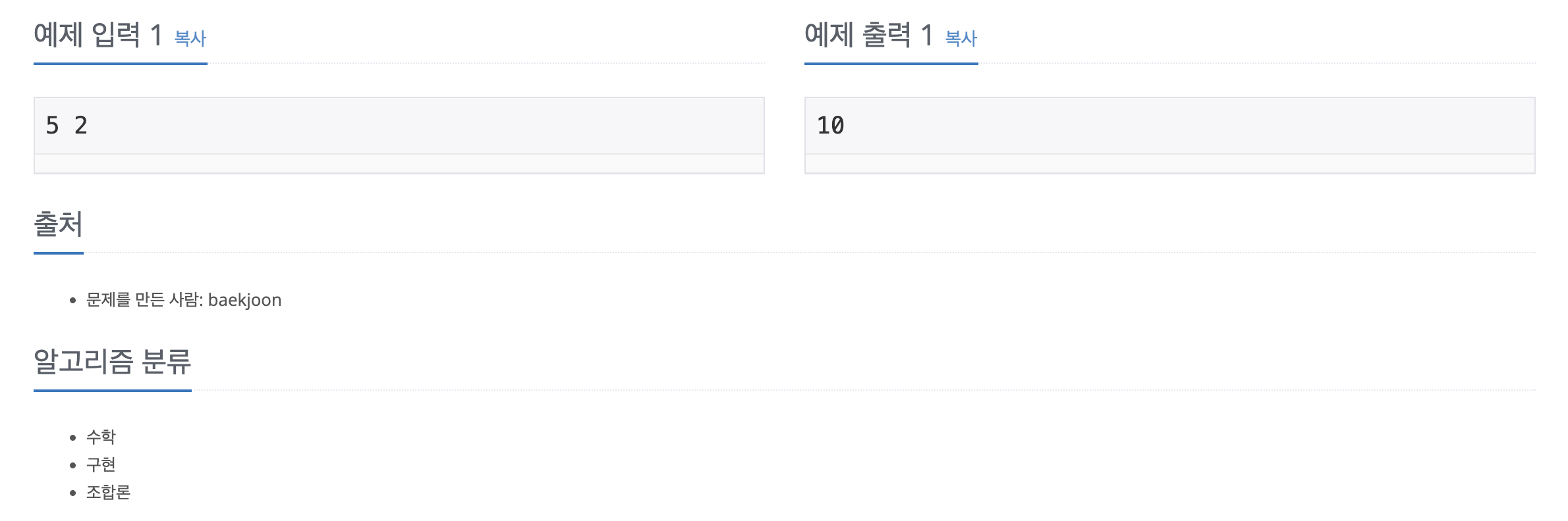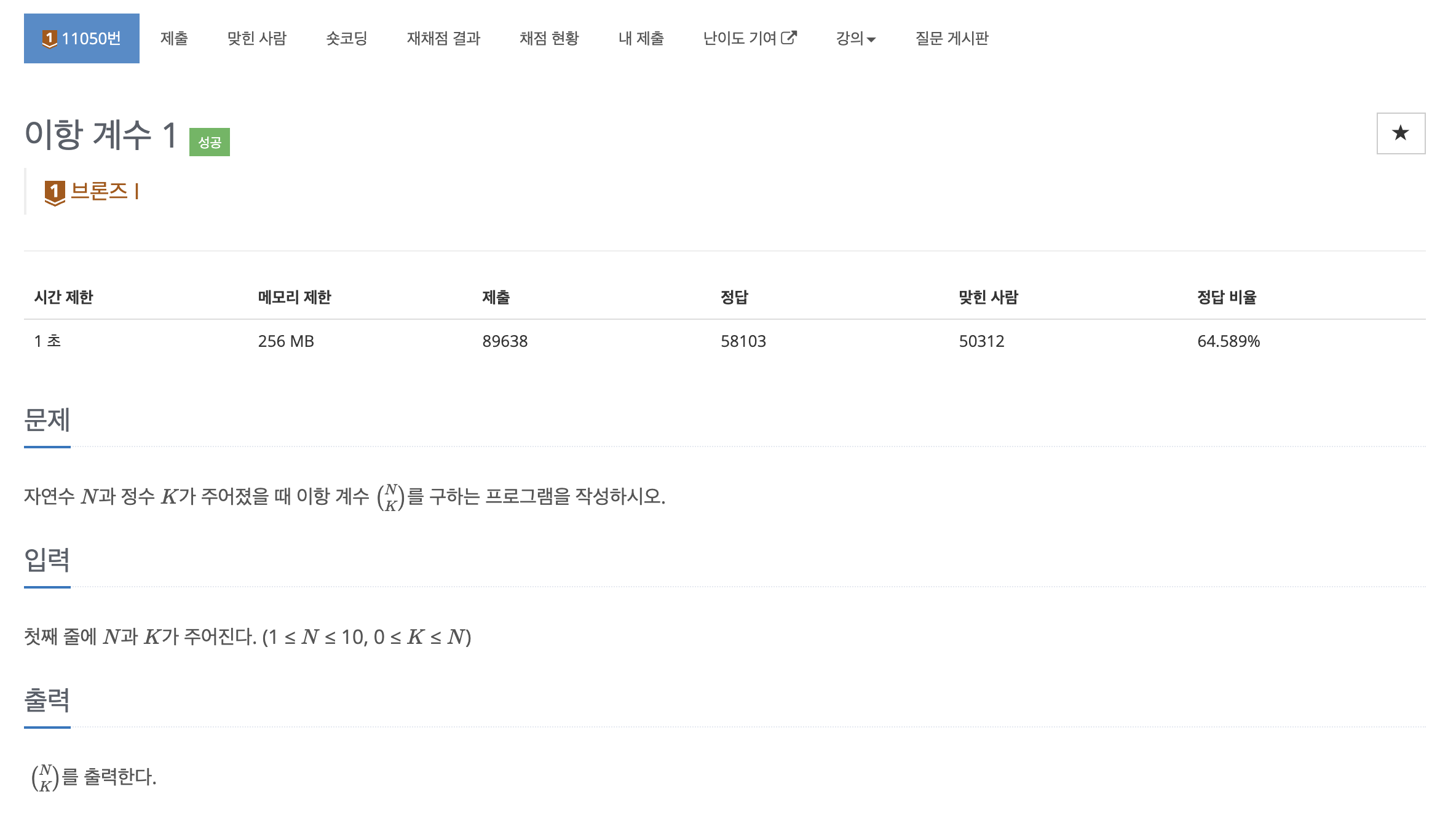 자연수 $N$ 과 정수 $K$ 가 주어졌을 때 이항 계수를 구하는 문제로 파스칼의 항등식을 활용한 재귀나 다이나믹 프로그래밍으로 해결할 수 있다.