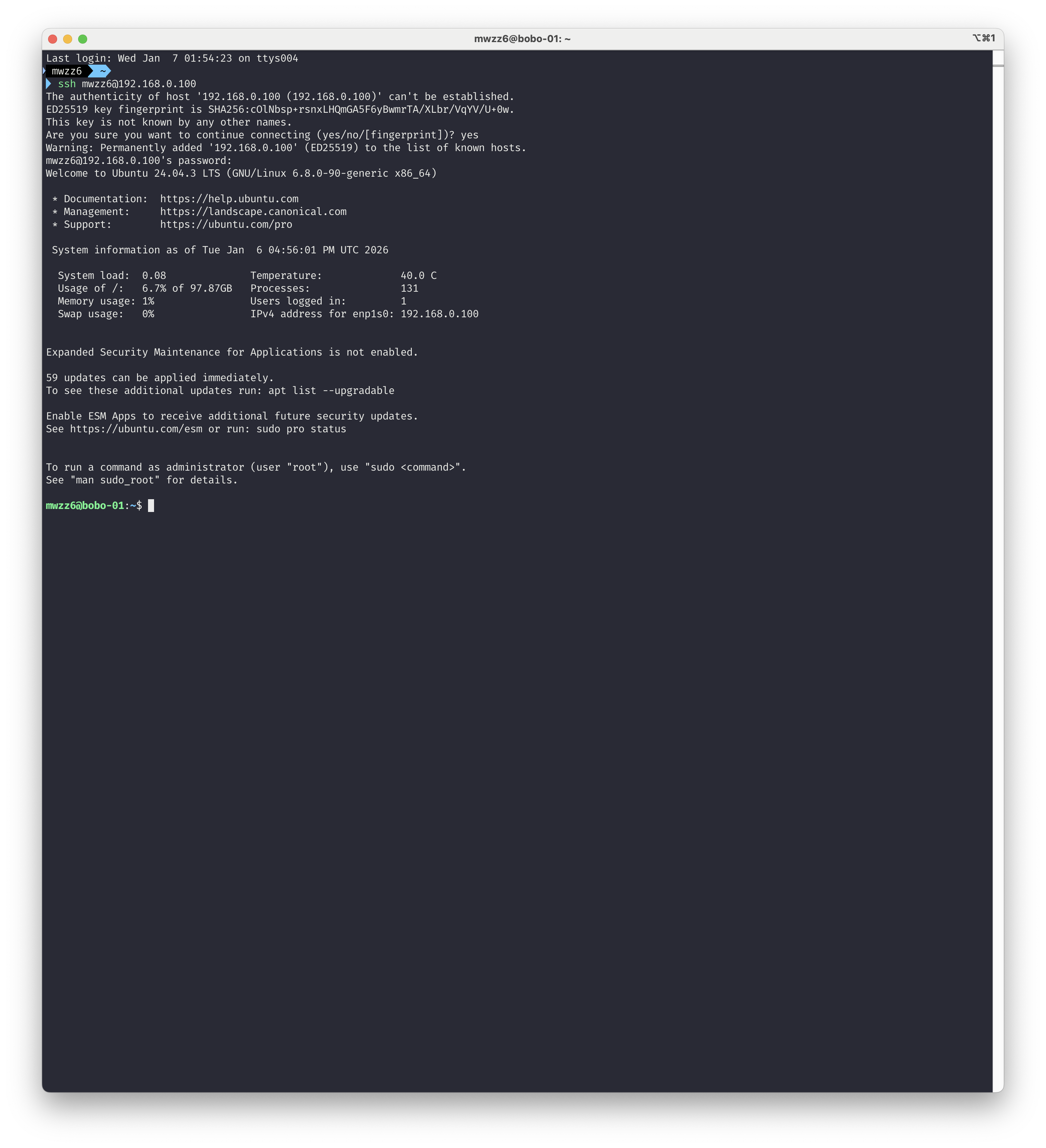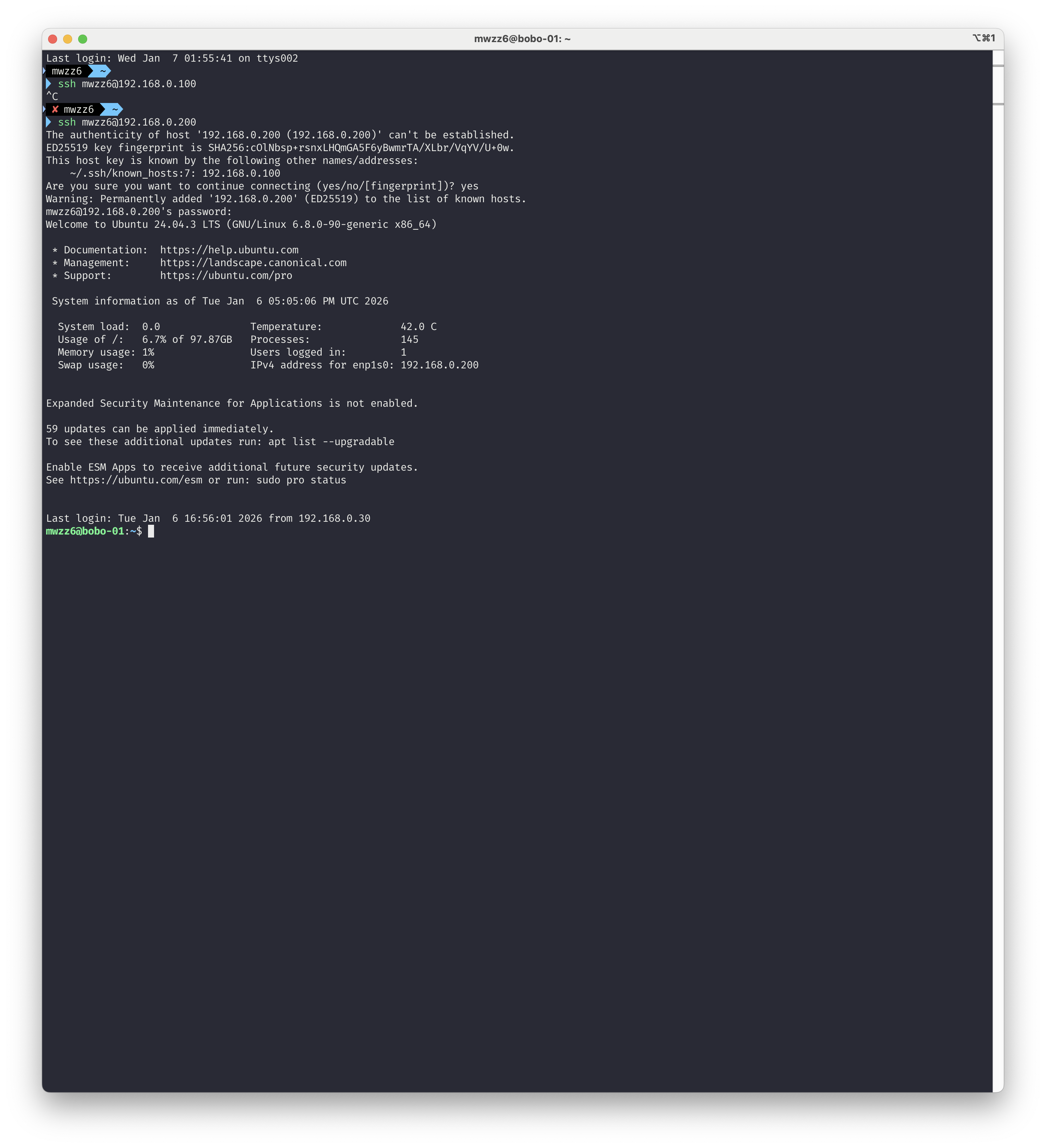 쉘이 mwzz6@bobo-01로 바뀐 것을 통해 SSH 접속이 잘됨을 볼 수 있다.