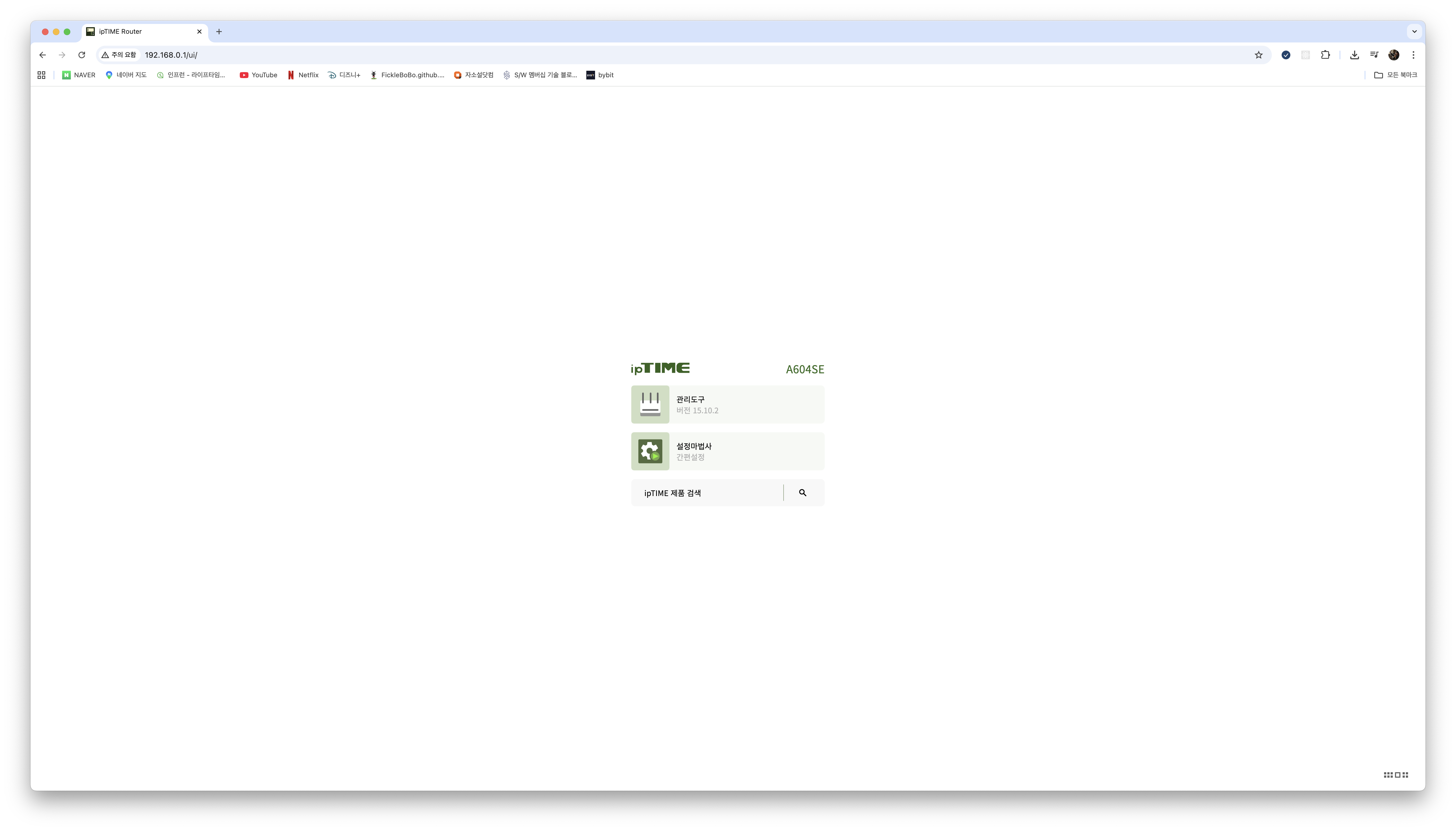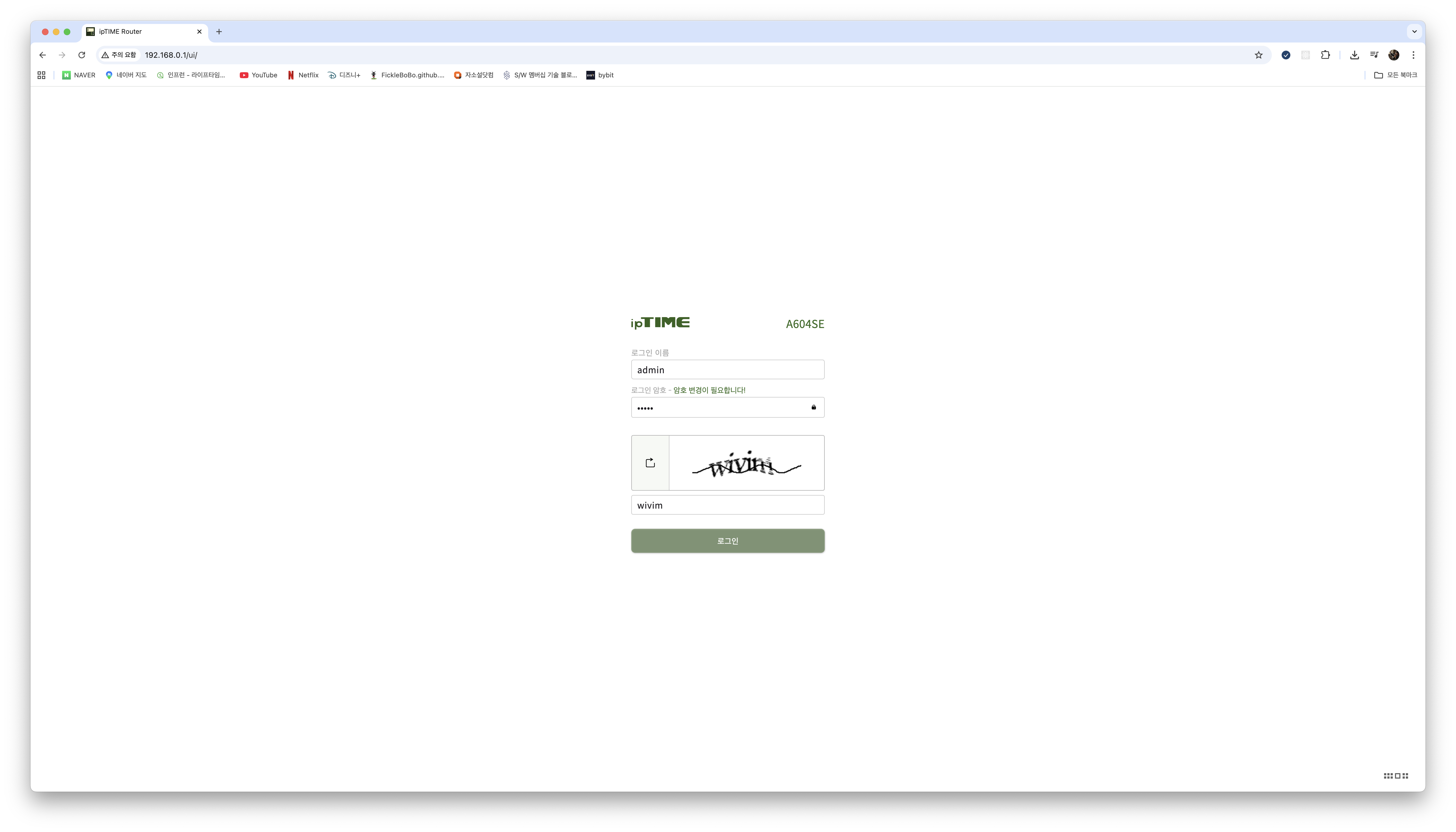 크롬 브라우저에서 192.168.0.1로 공유기 관리자 페이지로 접속해서 로그인을 해줬다. 공유기는 ipTIME A604SE를 사용중이다.