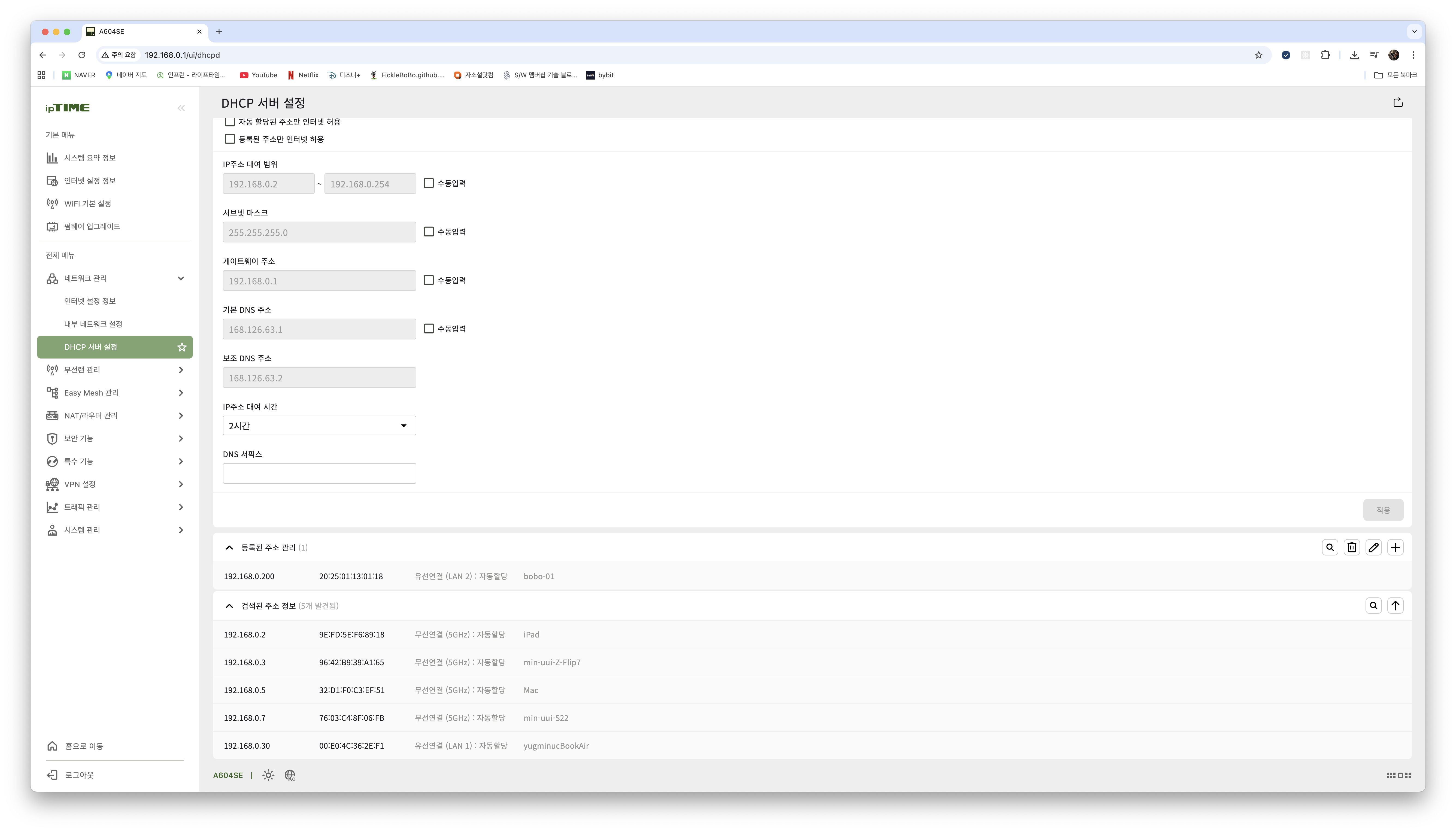 DHCP Server 설정 탭에서 현재 공유기에서 할당한 사설 IP와 기기 MAC주소들이 보인다.