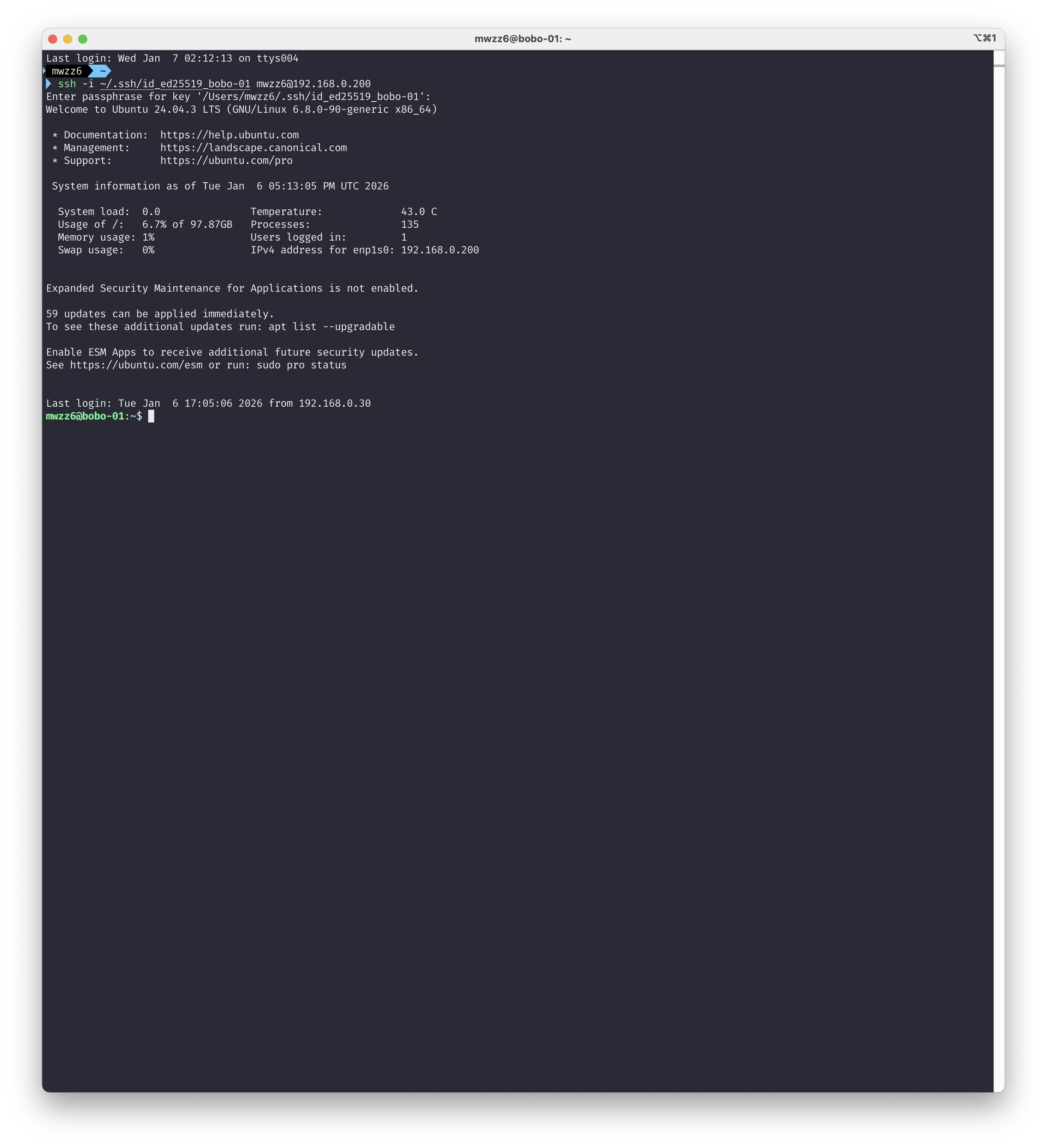 이러면 이제 ssh -i ~/.ssh/id_ed25519_bobo-01 mwzz6@192.168.0.200 명령어로 SSH 키를 통해 접속할 수 있다. 개인키에 passphrase 설정을 할 경우 개인키 비밀번호도 입력을 해줘야 한다.