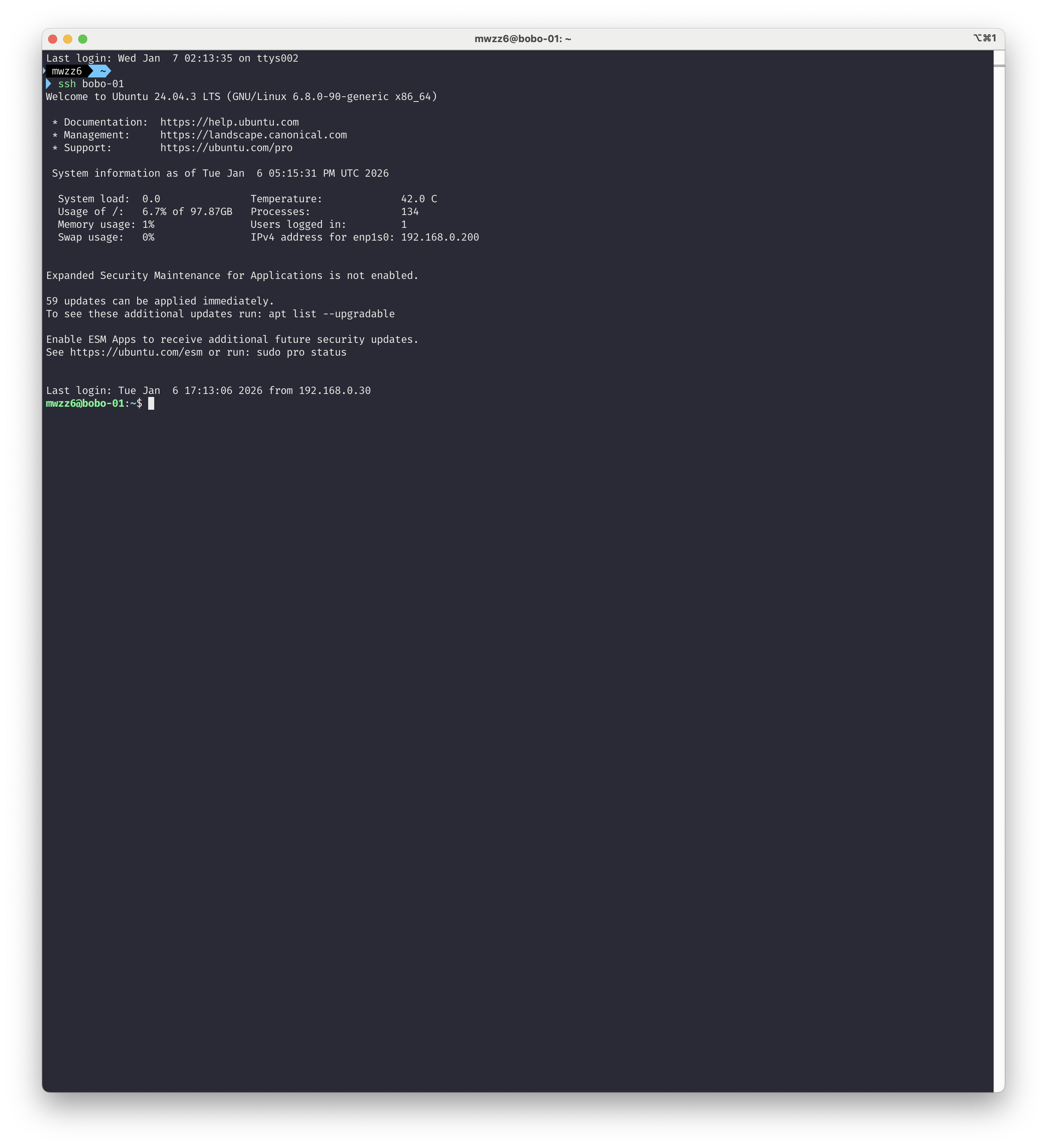 모든 설정을 마치면 아래처럼 ssh bobo-01로 간단하게 SSH 접속을 할 수 있다.