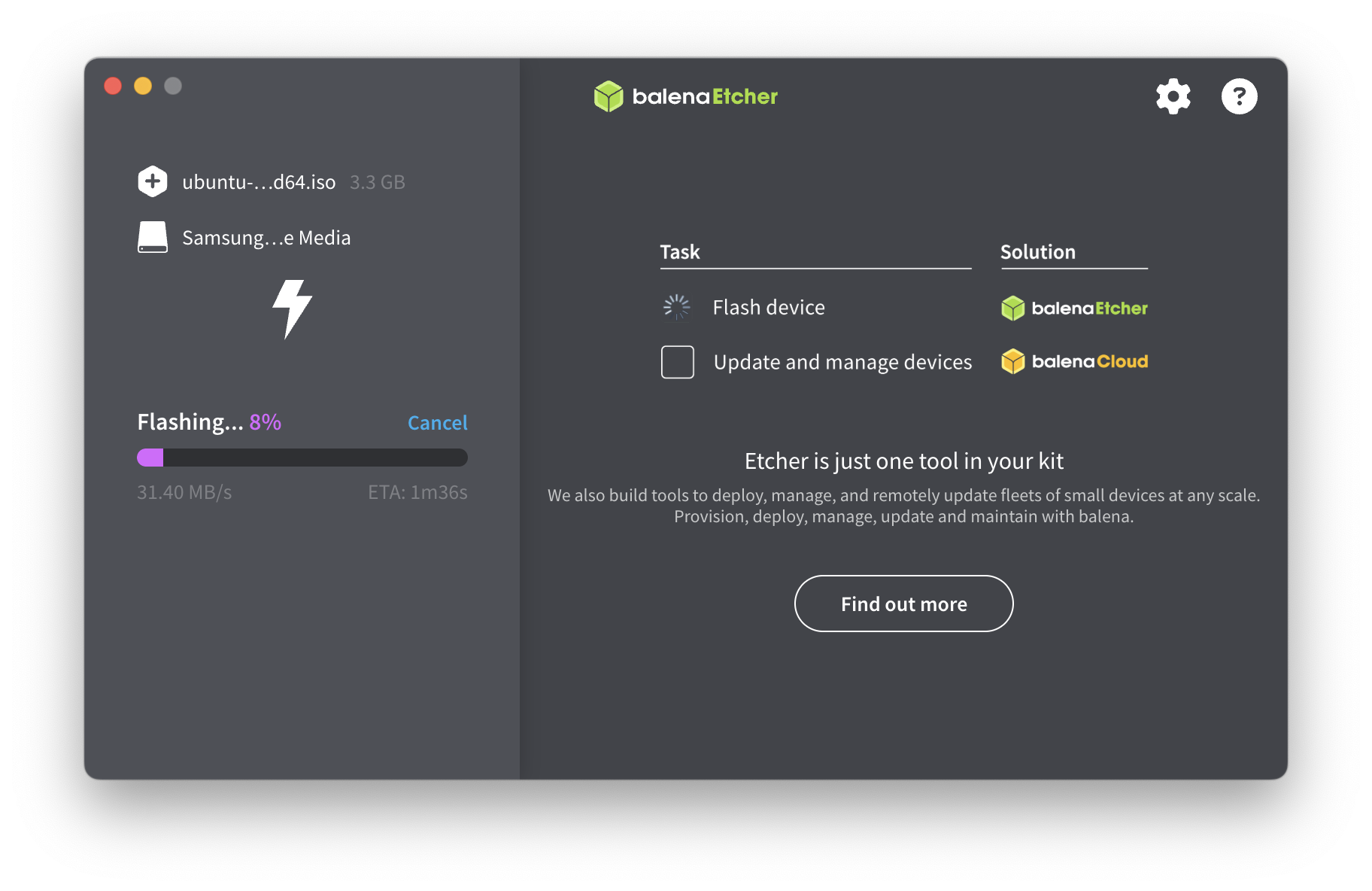 우분투 ISO 파일 다운로드가 끝났으면 부팅 USB를 만들어줘야 한다. macOS에서 GUI로 쉽게 부팅 USB를 만들 수 있는 balenaEtcher를 활용했다. 우분투 ISO 파일이 3GB 정도 되므로 부팅 USB는 8GB 이상은 되는 걸로 선택하고 내부에 파일이 있으면 삭제되니 미리 백업을 해줘야 한다.