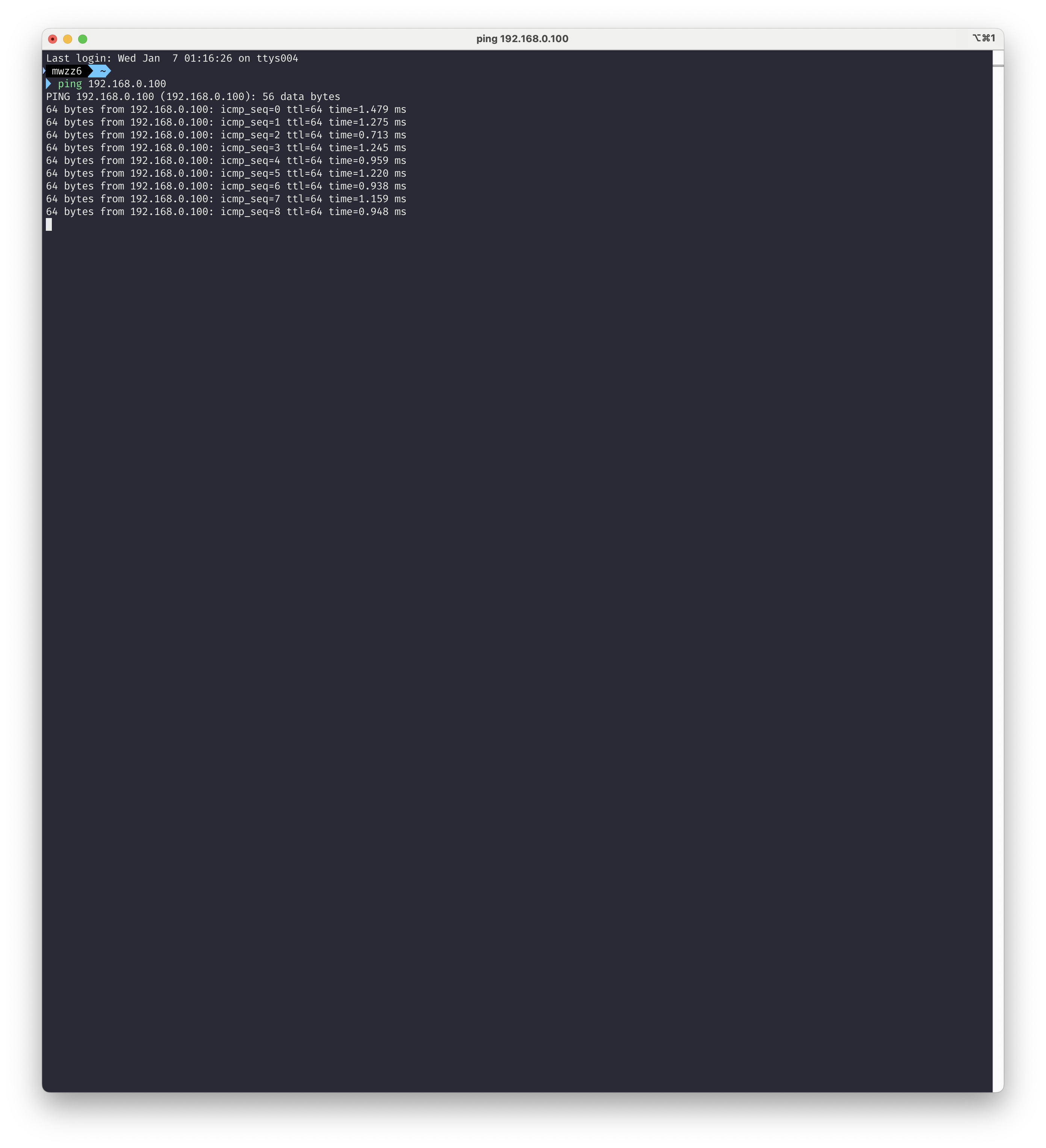 이제 맥북과 미니PC가 서로 통신이 되는지 ping 명령어로 테스트를 해줬다. 맥북은 공유기에 와이파이로, 미니PC는 공유기에 랜선으로 연결되어 있어서 같은 내부 네트워크라 잘 통신이 될 것으로 예상했다.(별도의 서브넷 분리를 안했다면)