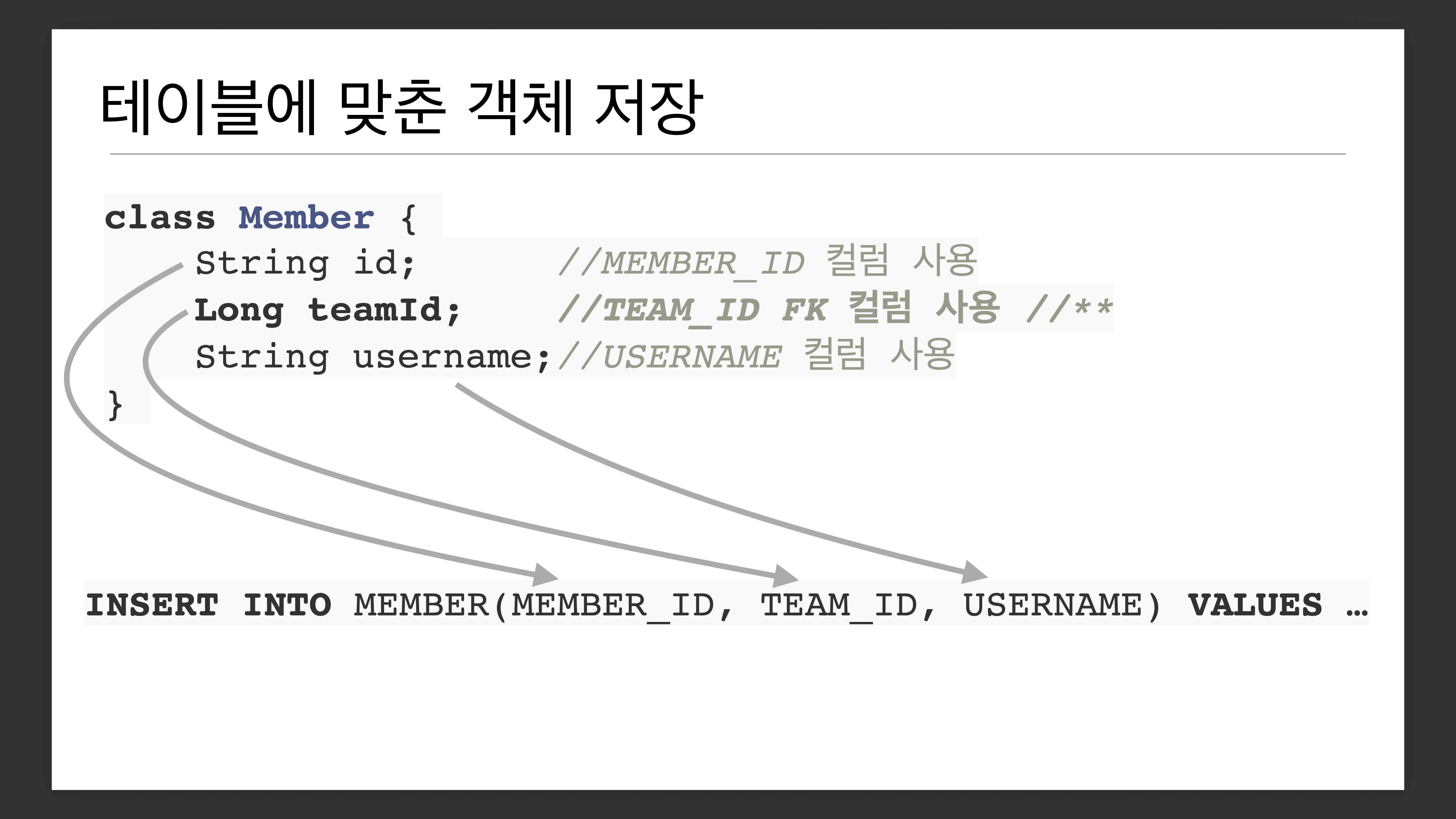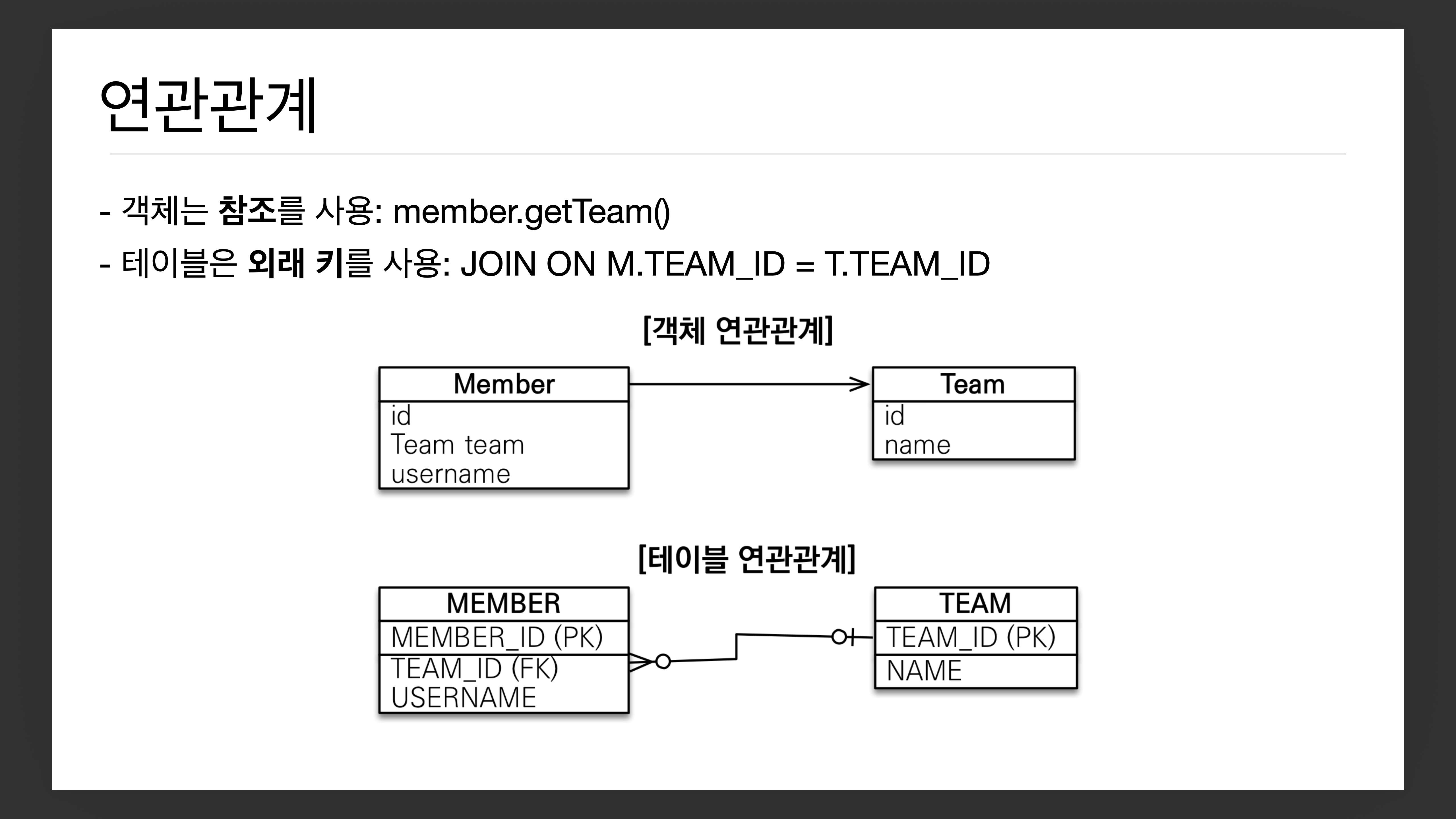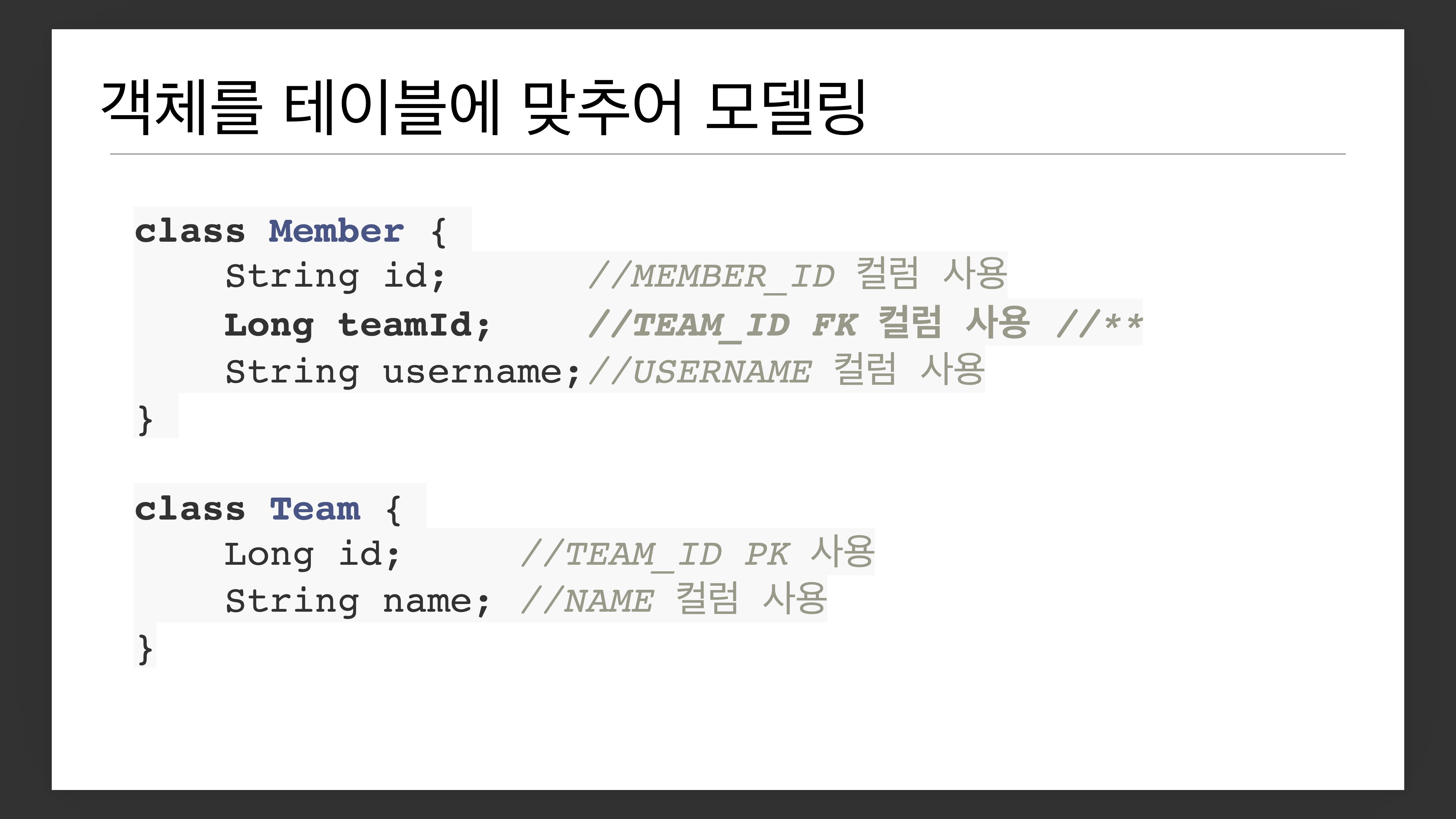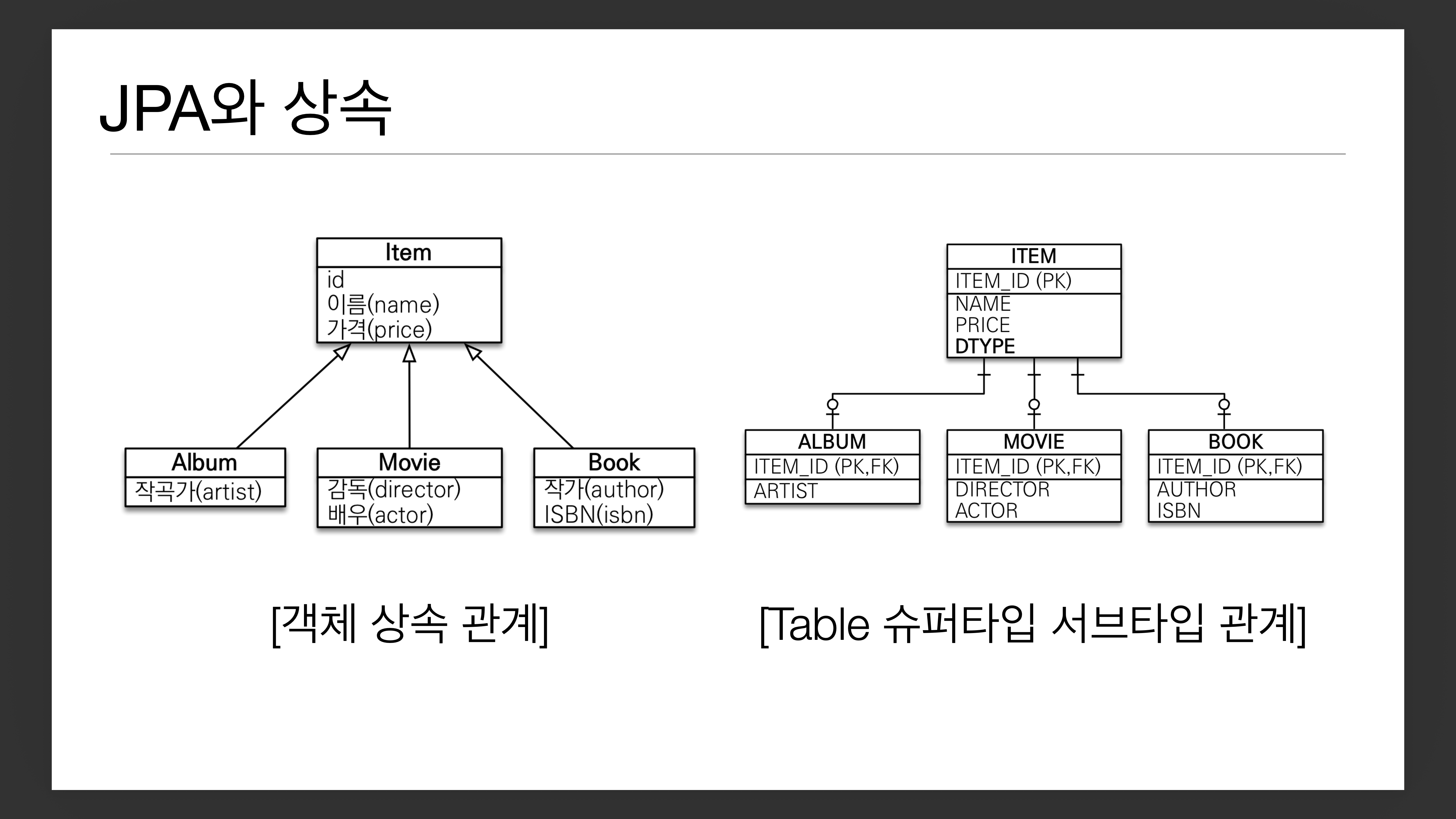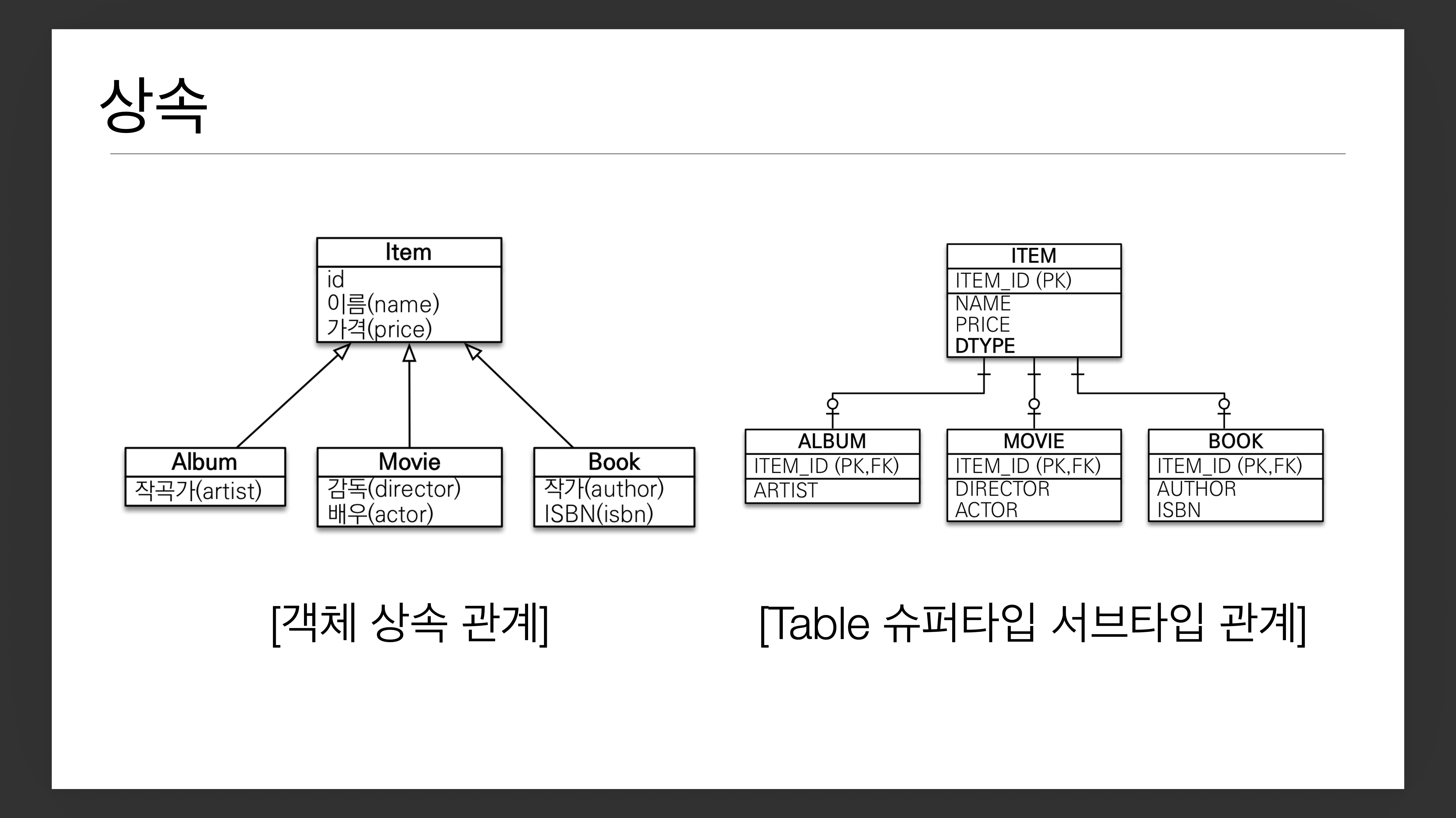 객체는 상속을, 테이블은 외래 키를 사용하기 때문에 어느 쪽에 중점을 두느냐에 따라 모델링이 달라진다.