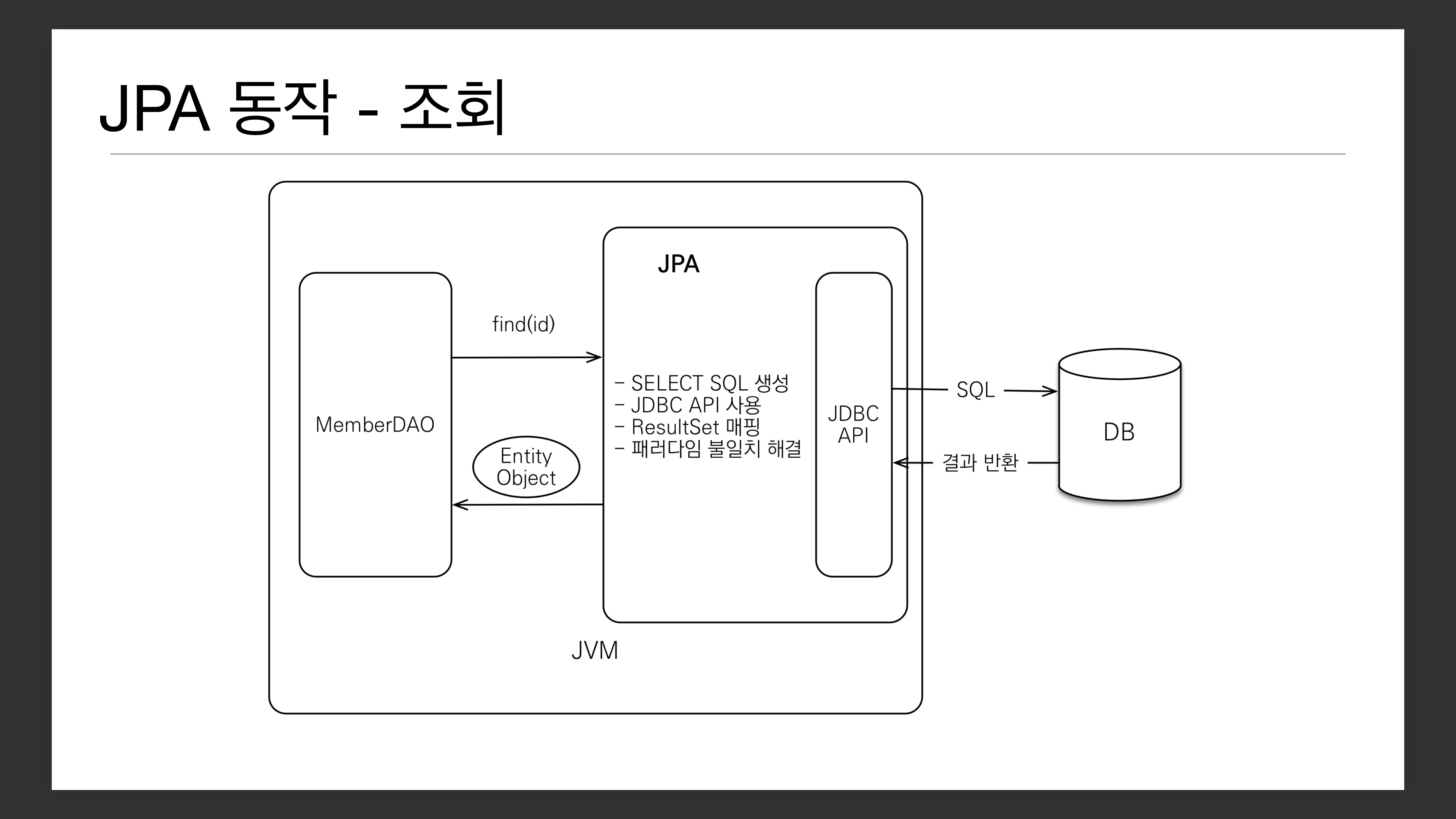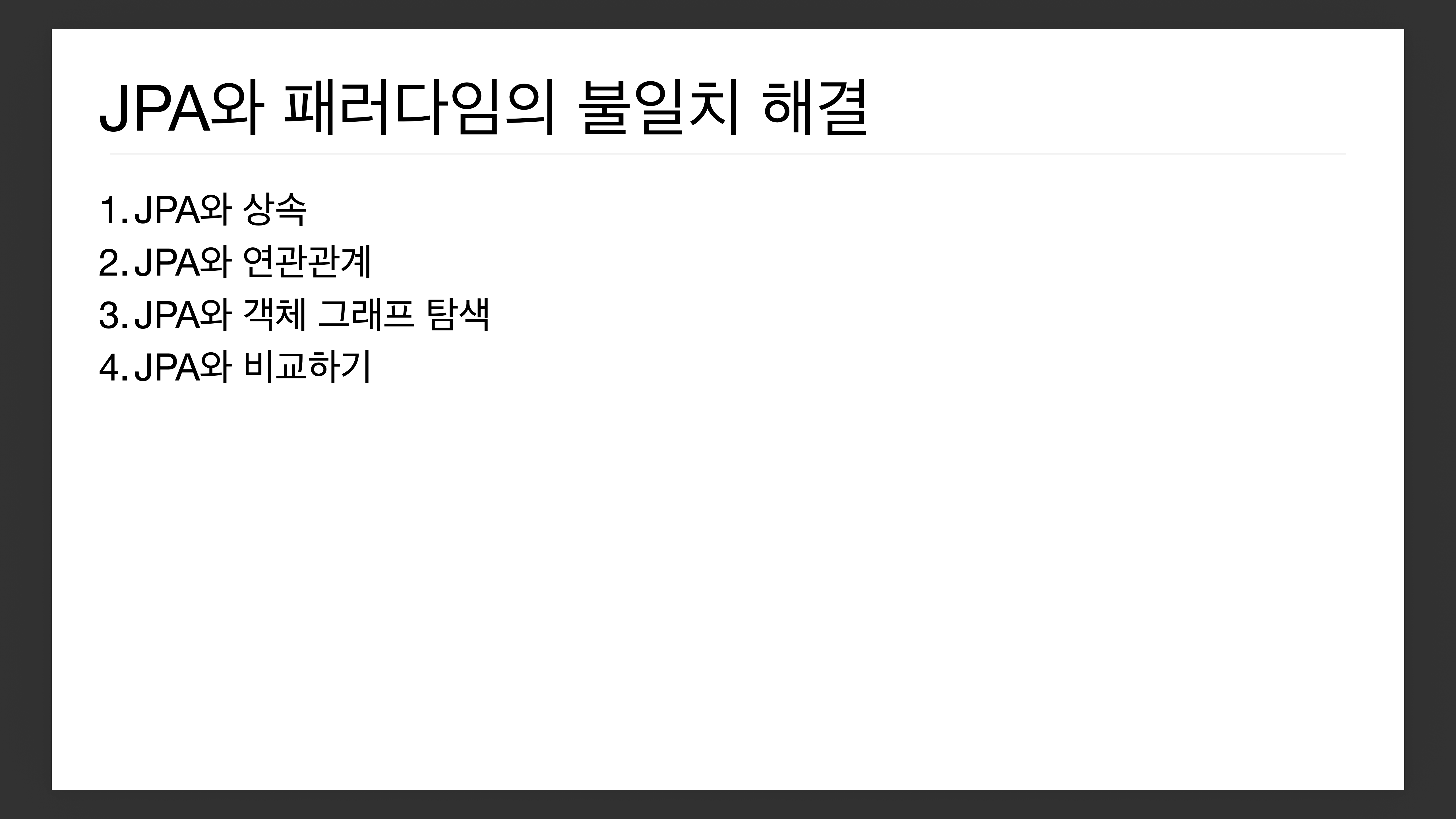 지금 시대는 객체를 관계형 DB에 보관하는 시대다. 관계형 DB에 객체를 보관하려면 SQL을 사용해야하는데, 이는 CRUD의 반복과 지루한 코드를 동반한다. 결과적으로 SQL에 의존적인 개발을 피하기 어렵다.