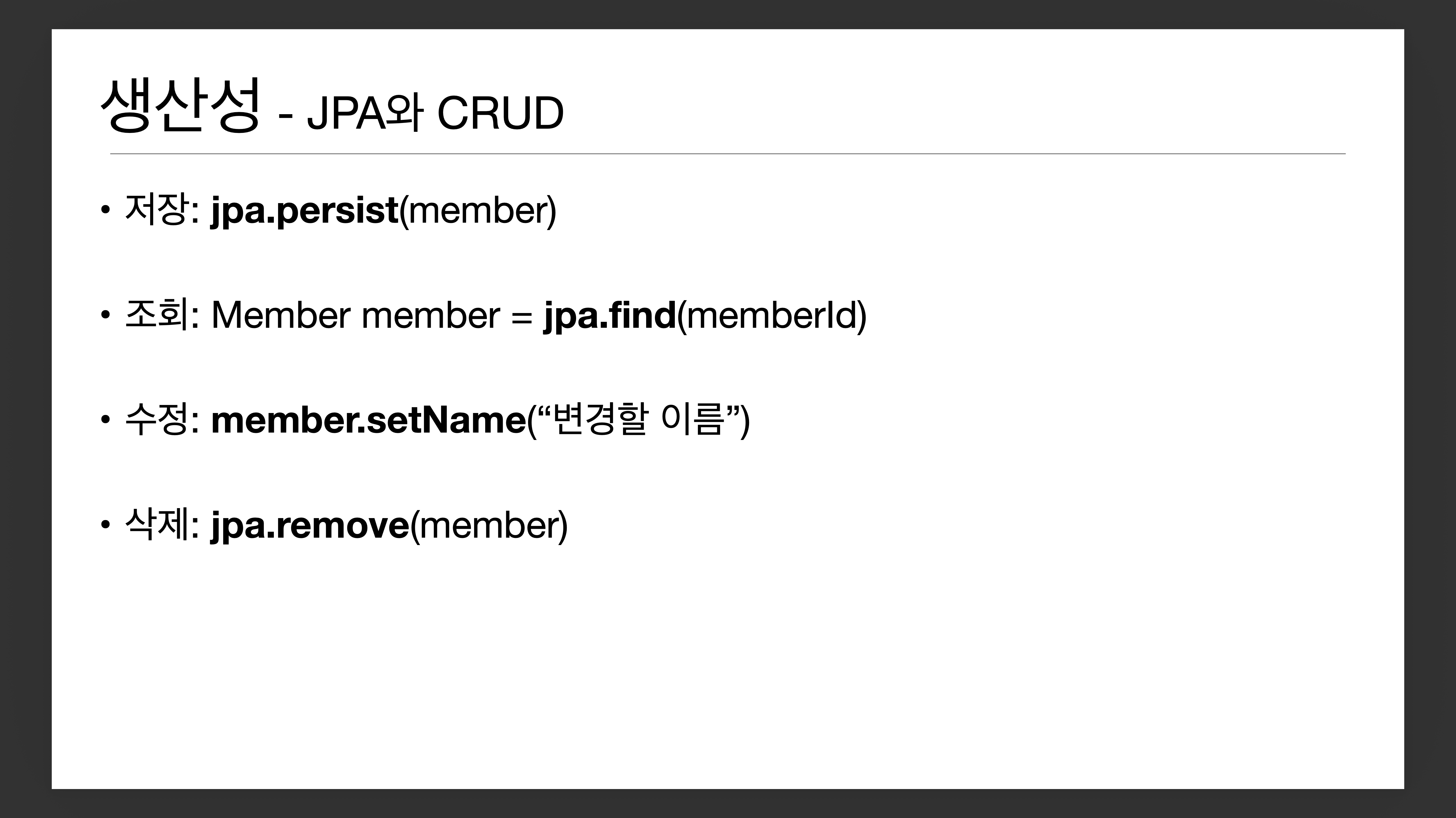 JPA를 사용하면 CRUD에서 생산성이 크게 향상된다.