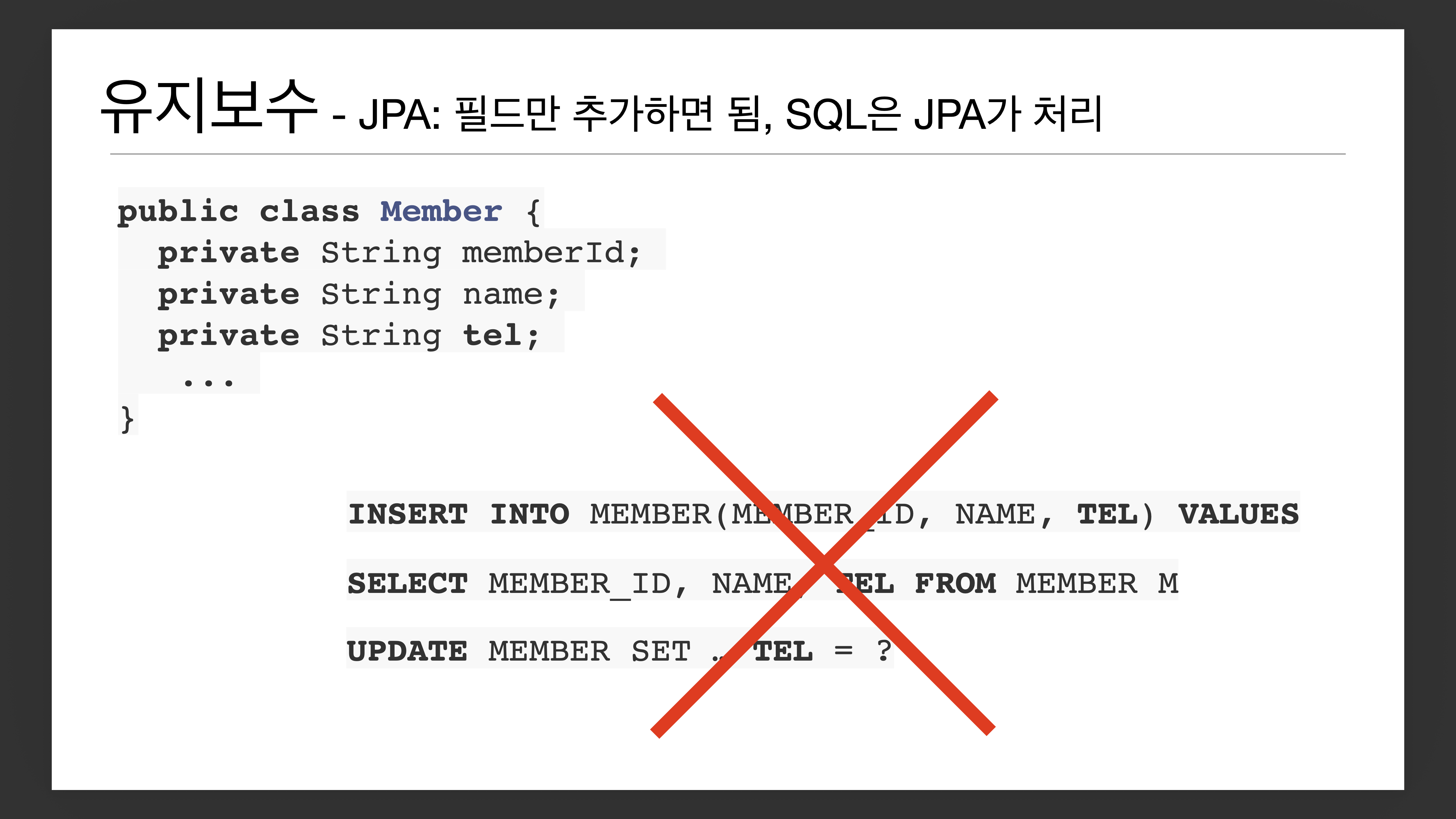 JPA를 사용하면 필드가 변경되는 상황에서 모든 SQL을 더 이상 수정할 필요가 없다.