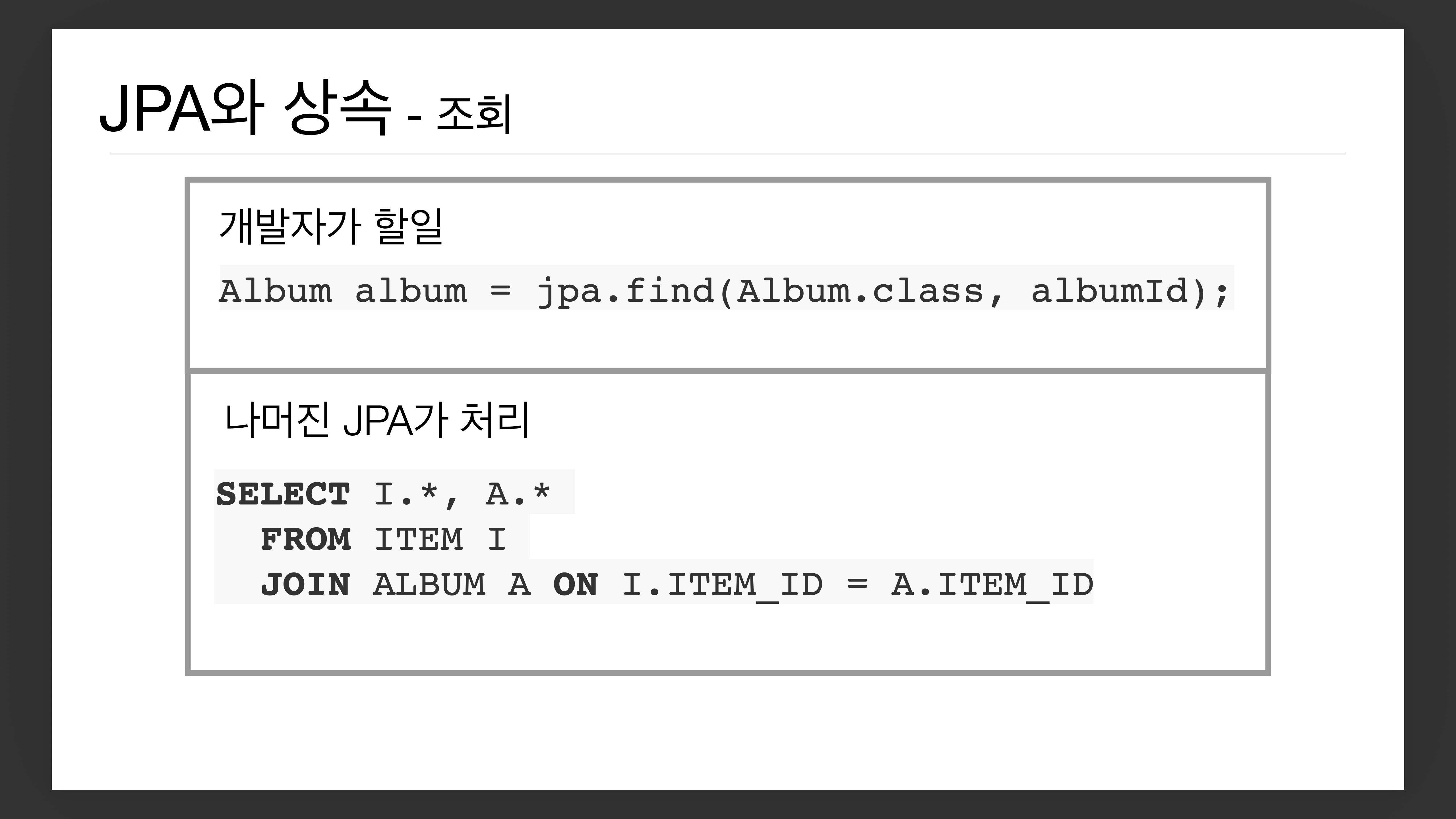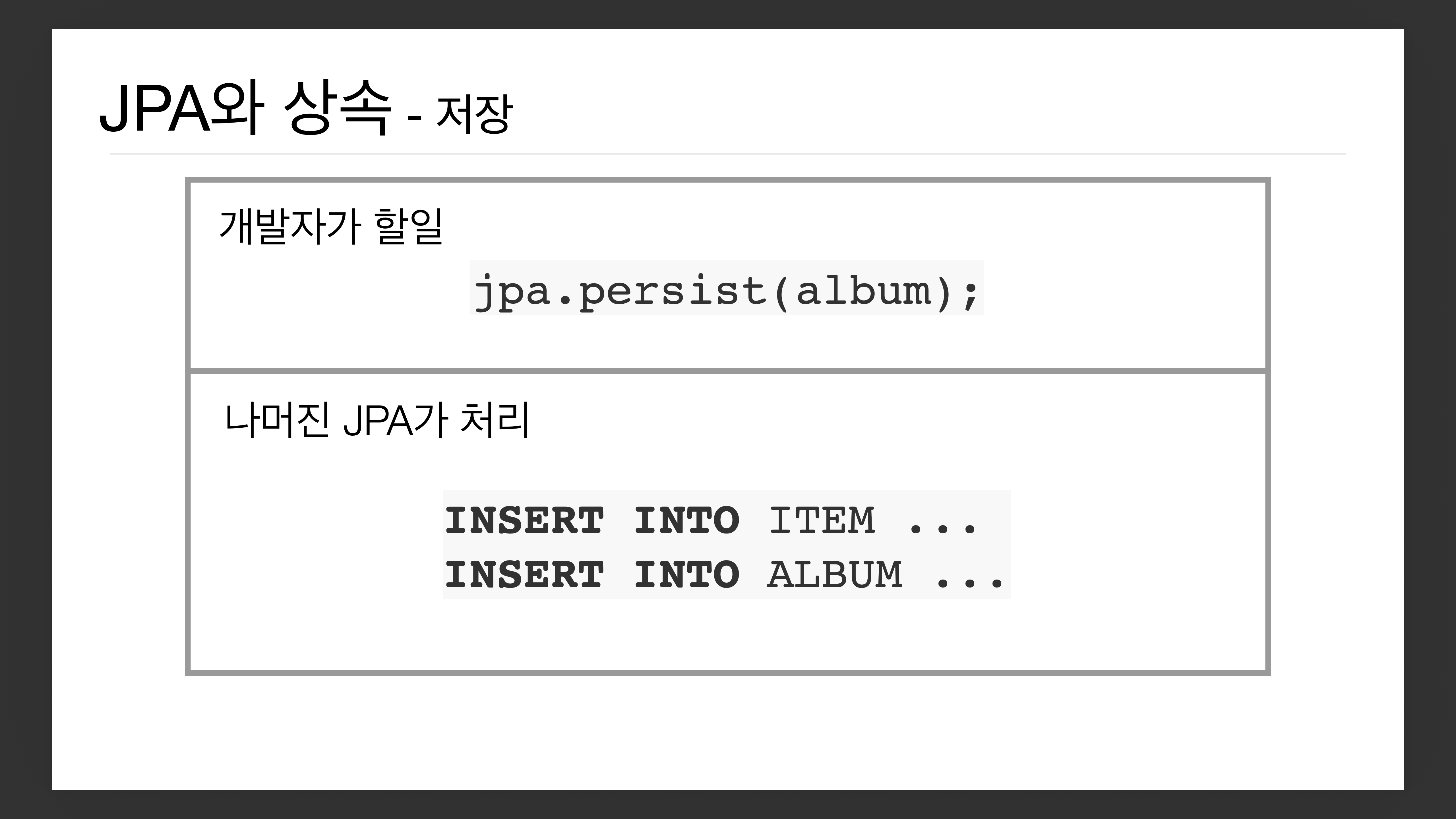 상속 측면에서 개발자는 객체를 컬렉션에 저장하듯이 다룰 수 있으며 나머지는 JPA가 처리해준다.