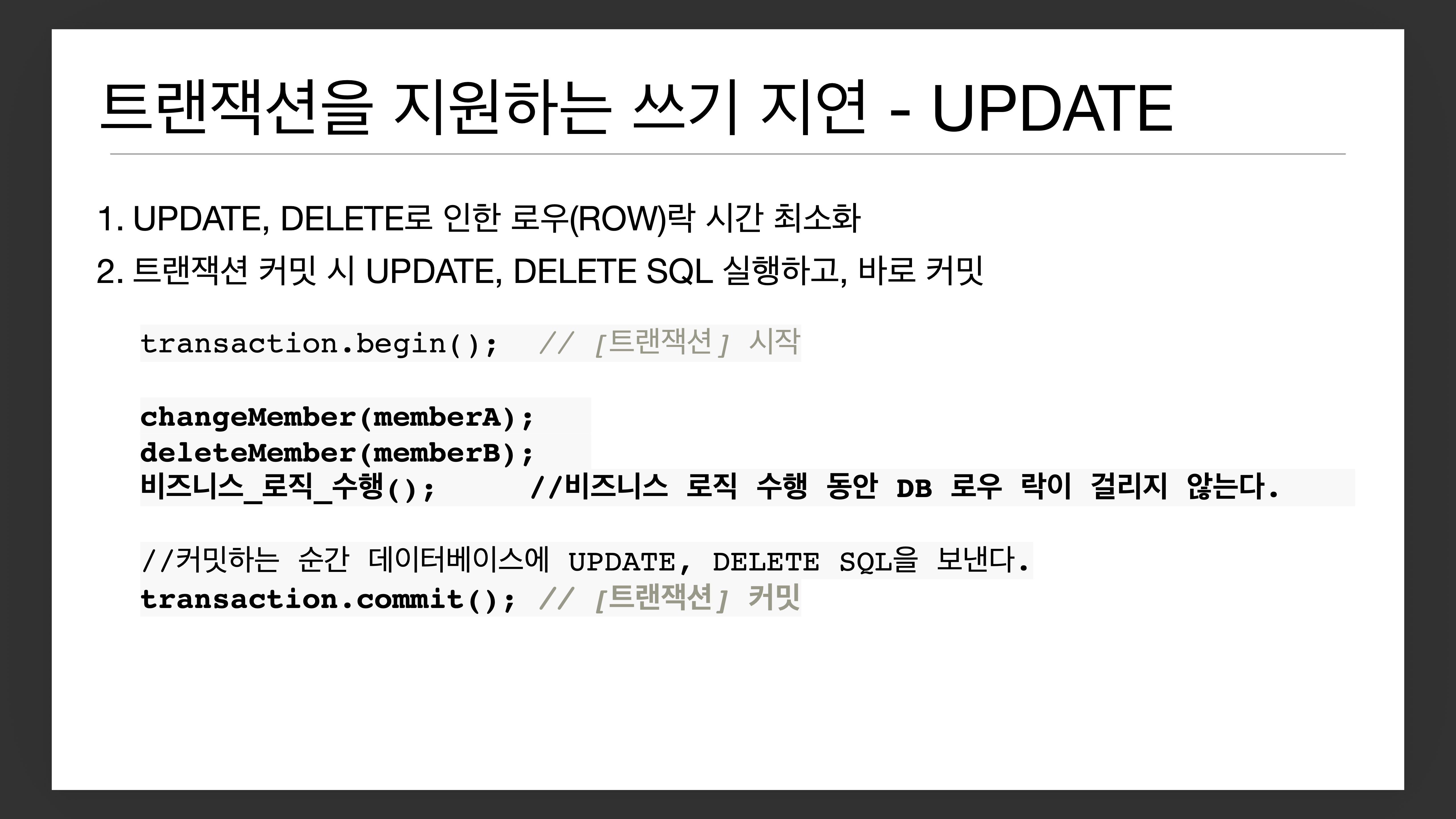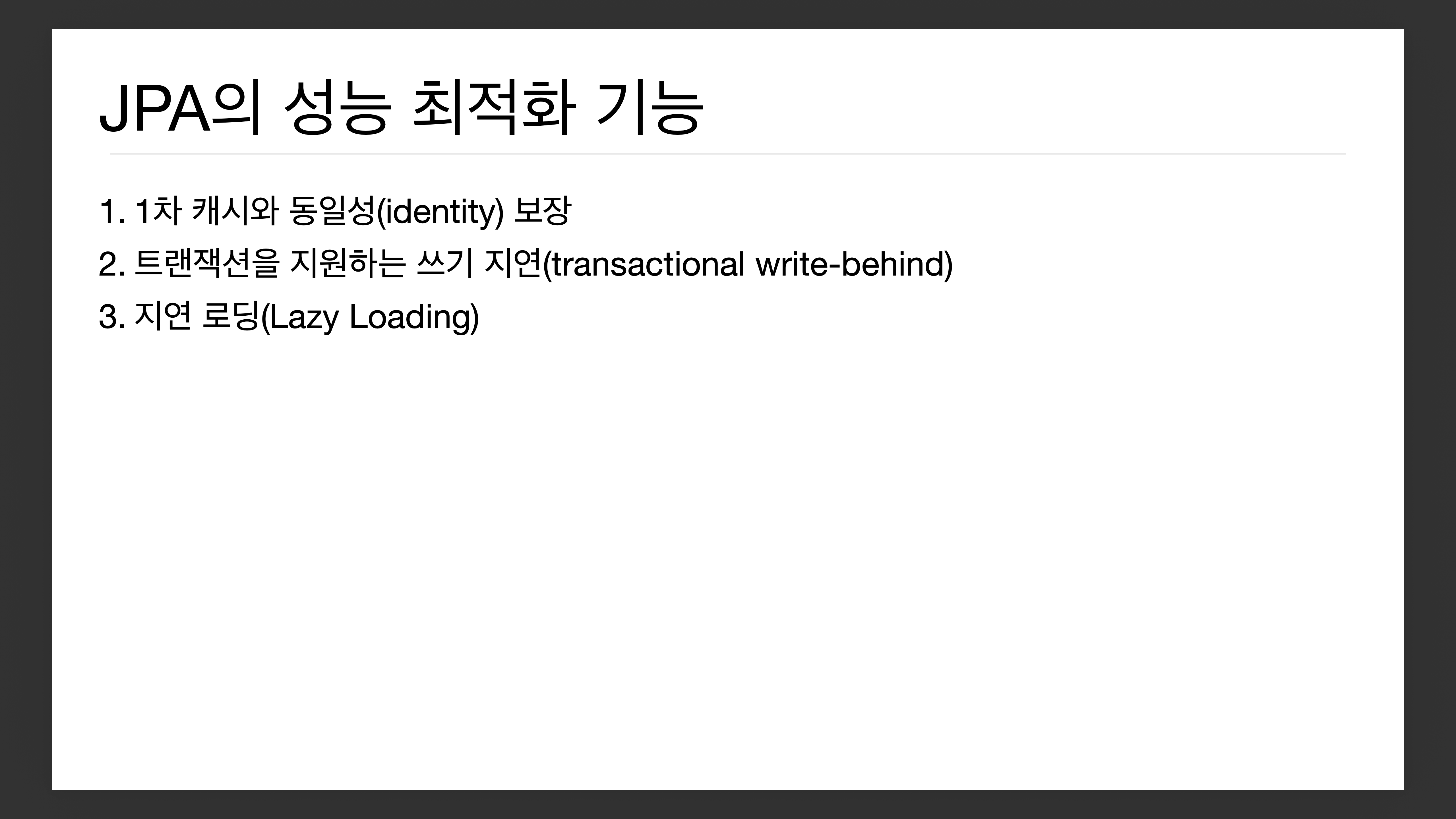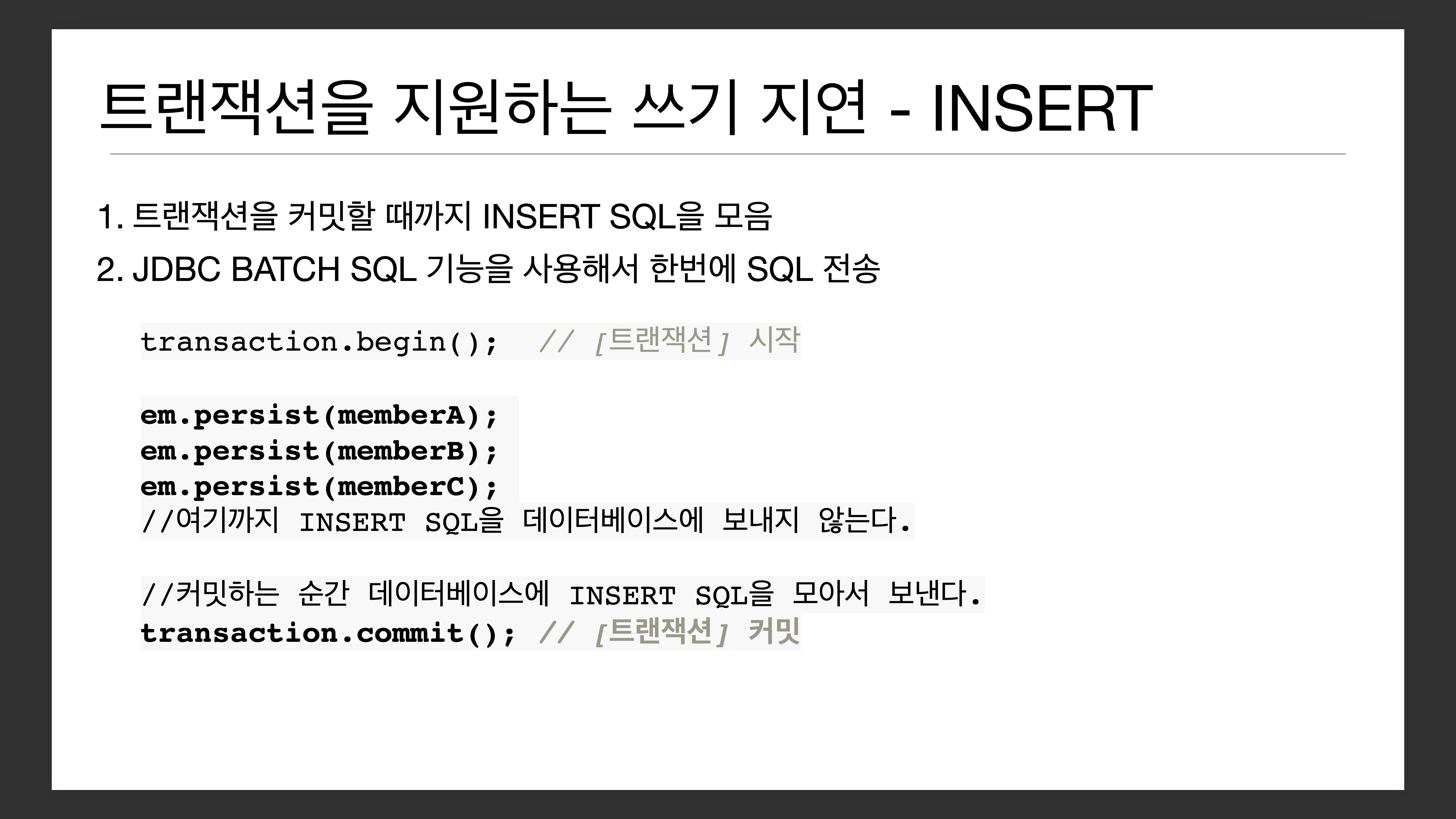 트랜잭션을 커밋할 때까지 INSERT 쿼리를 모았다가 JDBC BATCH SQL 기능으로 한번에 전송하는 쓰기 지연을 지원한다.