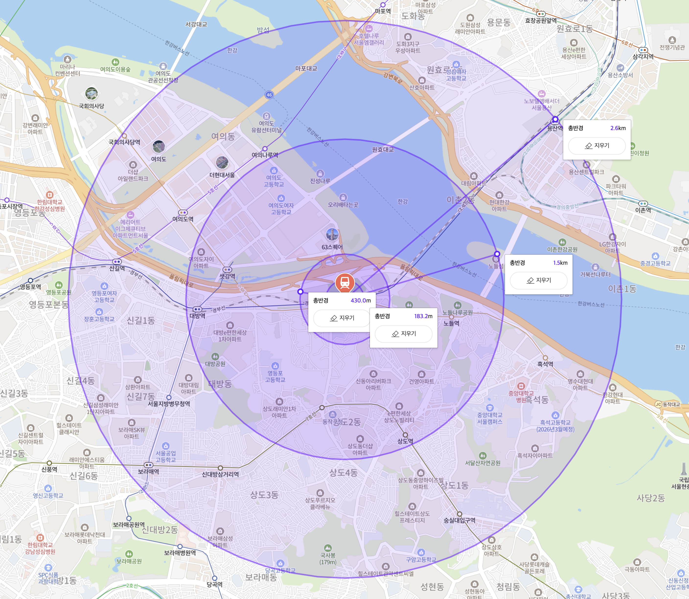 노량진역과 노량진 맥도날드와의 거리가 약 183m, 노량진 수산시장과의 거리가 약 430m, 노들섬 라이브하우스와의 거리가 약 1.5km, 용산역 CGV와의 거리가 약 2.6km로 거리별로 잘 나온 것을 볼 수 있었다.(좌표 데이터를 OSM과 네이버 지도에서 어림으로 찍어서 약간의 오차는 있다.)